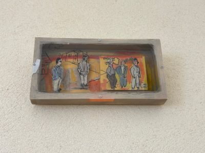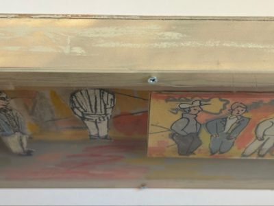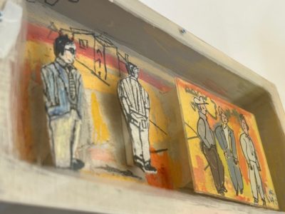 左の二人の男は段ボール紙に描かれ、背面から少し浮かしています。