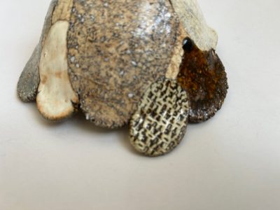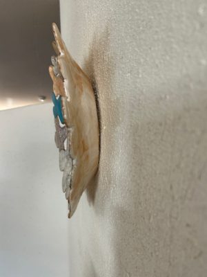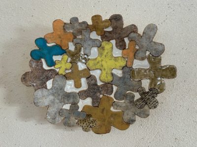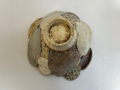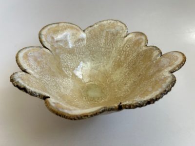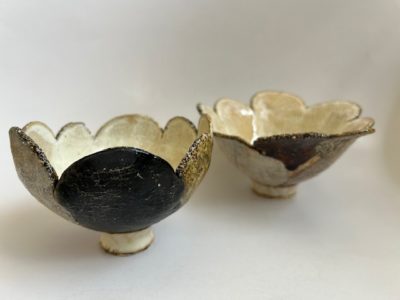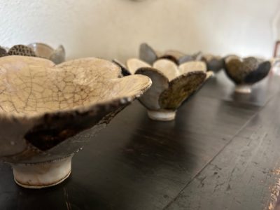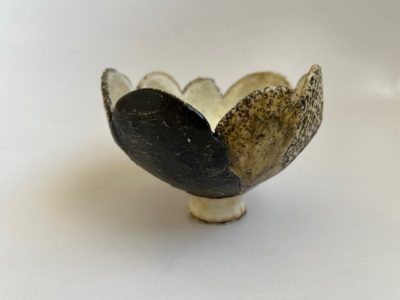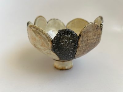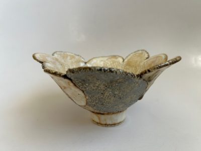今展の顔とも言える花が開いたような造形のお碗です。一枚一枚違う色やカタチや仕様の花びらを貼り合わせ作られています。