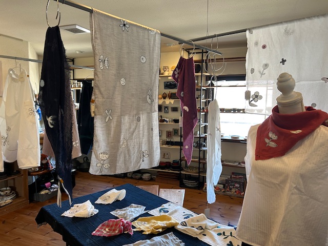 麻やコットン地にしのぶさんの植物や鳥などのモチーフがちりばめられたアイテムが中心。