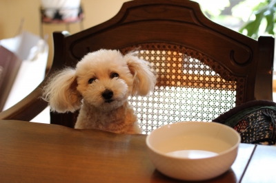葉子さんの愛犬・マカロンちゃんもテーブルにつき、