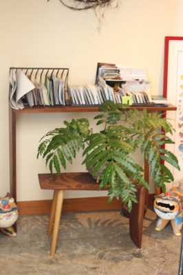片側が板状のスツールに植物の鉢を載せています。