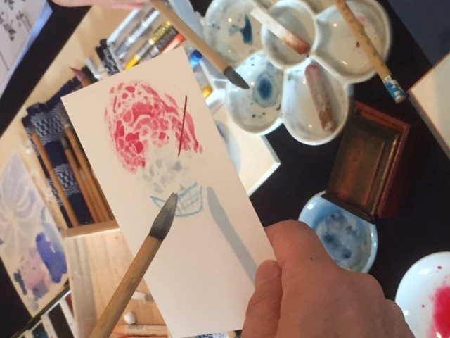 講座の前半は、クレパスと顔彩を使ってワークショップ。