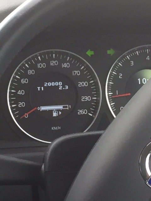 車の走行距離、ジャスト2万キロのメーターを後部座席から撮る。