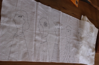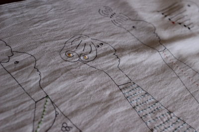 66人の絵が描かれ、ところどころカラフルなステッチが施されています。