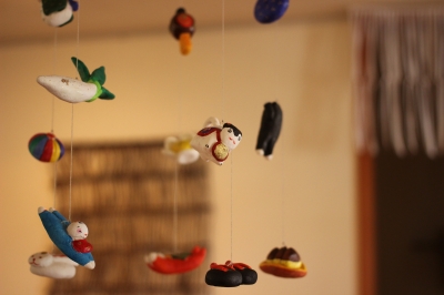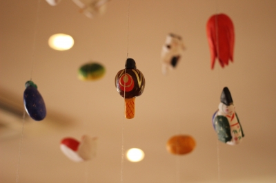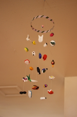 紙粘土で作られためでたいモチーフがたくさんぶらさがっています。