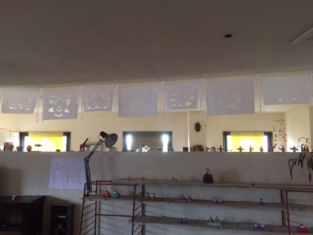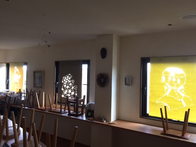 ギャラリーとカフェの境の天井に吊るしているこれらの切り紙。