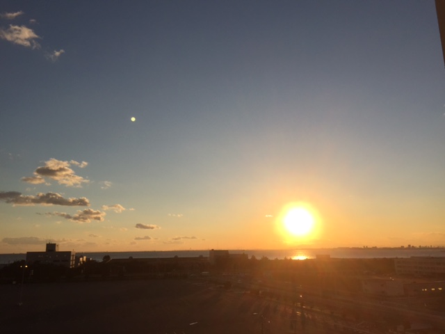 駐車場に着いたら幕張の浜に落ちるきれいな夕日が見えた。