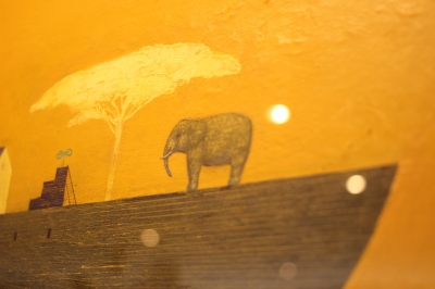 舟に動物や木や家が。