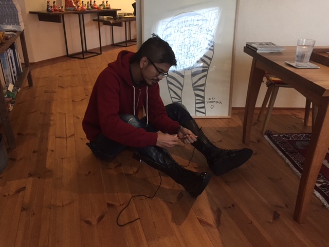 ・・・と私のお宝の蝶野正洋さんのリングシューズをはく豊永さん。