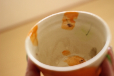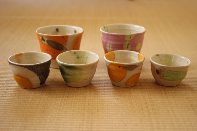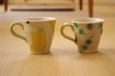→枝豆、レンコン、バナナ、スイカ、ニンジンなど楽しく美味しい絵柄の陶のカップ