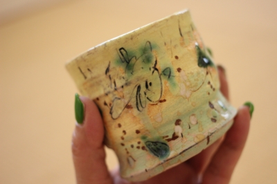 何度も塗ったり描いたりを重ね、おもしろい表情のカップ。