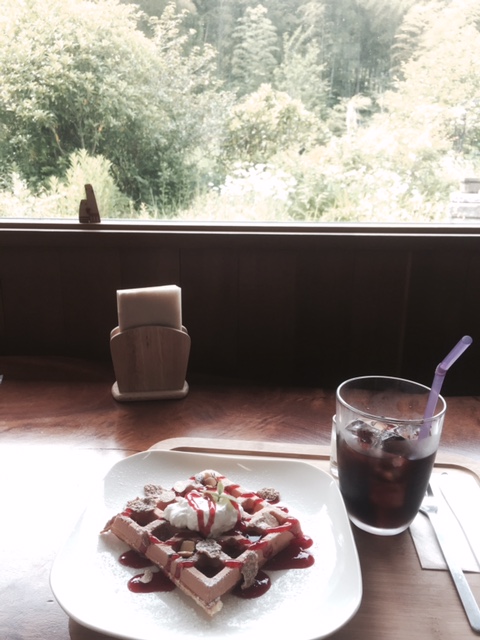 豆腐ハンバーグのランチを食べた後、お庭を愛でながらワッフルをいただきました。