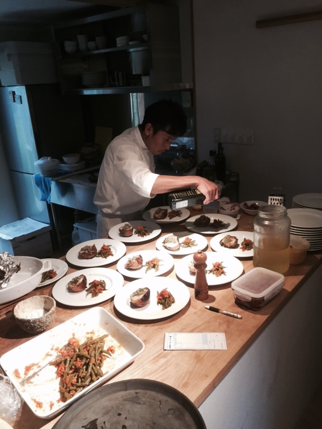 シェフ・片岡晃一さん、丁寧かつ大急ぎで準備。