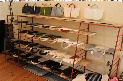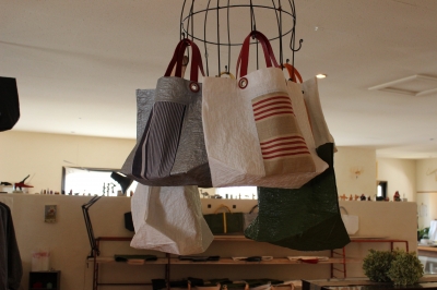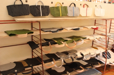 軽くて丈夫なビニールシート素材と、世界のヴィンテージの布のコンビ。