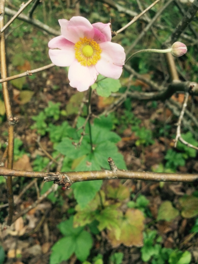 今朝、庭に薄ピンクのシュウメイギクが一輪だけ咲いていました。