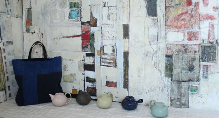 油彩画、裂き織りのバッグ、陶器、