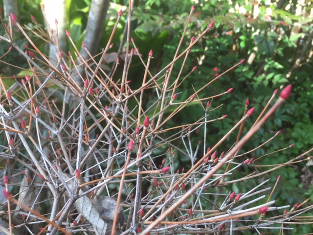 庭のドウダンツツジの枝の先にマッチ棒のような新芽が出てきました。