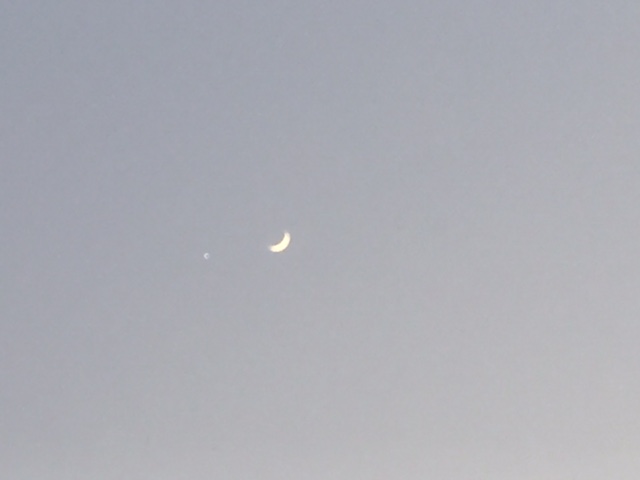 夕方の薄明るい空に三日月(五日月)と宵の明星が輝いていました。
