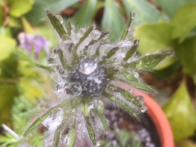今朝、オキナグサに雨の水滴がたくさんついていてキラキラしていました。