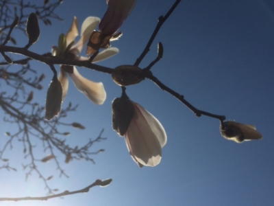 22日の朝、自宅前の通りの街路樹のコブシの花が少しずつ咲き始めてきました。