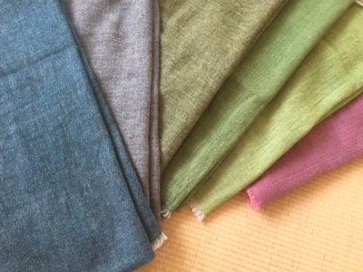 シルク、麻、ウール×麻など、心地よい織の生地に天然染料で染められています。