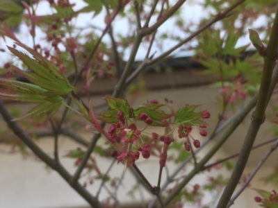 ヤマモミジの小さな赤い花、若い葉が出てきました。