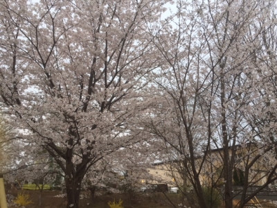 はなうさんの大きな窓から昭和の森の桜が見える。