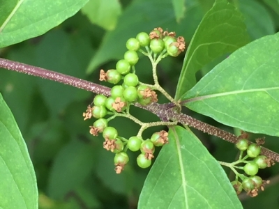 庭のムラサキシキブの花が終わって緑の実が成りました。