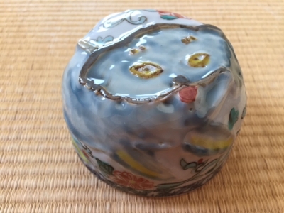 九谷焼では”五彩”と呼ばれる、赤・黄・緑・紫・紺青の5色を使い、盛るように上絵を施したもの。