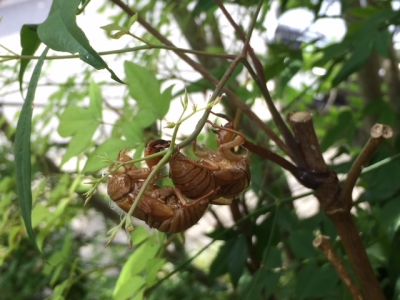 今朝、セミの抜け殻をあちらこちらで発見。