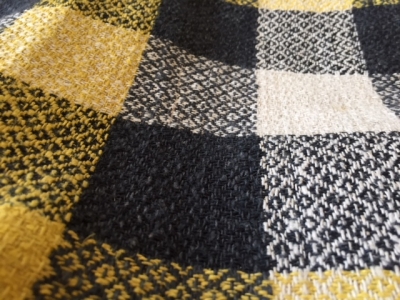 落ち着いた黄色×黒×ベージュの一松地に白の細かい織柄がナイス。