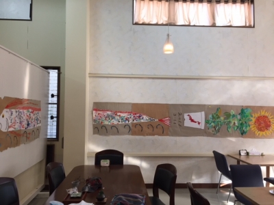 カフェスペースの壁に貼られた魚とヒマワリの紙のコラージュ。