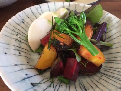 ビーツ、島ニンジン、フルーツかぶとスティックセニョールの温サラダ