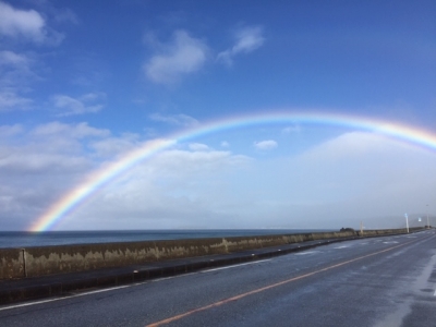 道中、ものすごい虹を見た。