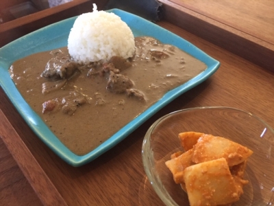 トマト、ココナッツベースに黒胡麻を加えたゴボウ入りのチキンカレー。