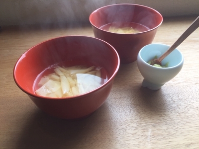 カフェでのお召し上がりの味噌汁と漬物のセットがおむすび+350円となります。