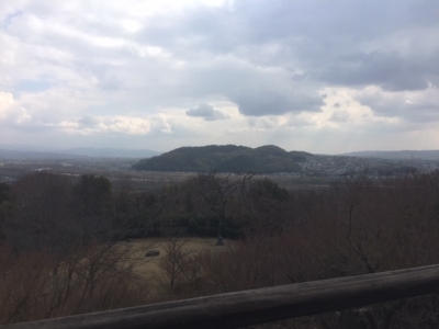 桂川、木津川、宇治川の三つの川と低い山々を臨みます。