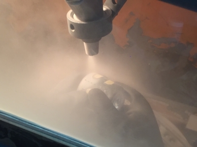 細かい砂のような粒子をガラス面に吹き付ける。