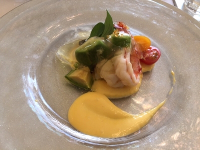 『シーフードのマリネ、サラダ仕立て、コンソメシートを纏って』