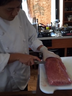 小島さん、なにやら立派な美味しそうなカタマリをカット。