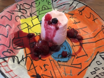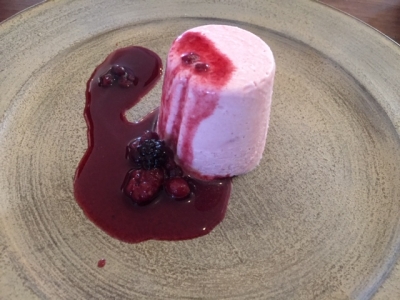 型に入れて凍らせたものに、熱いベリーソースをかけたドルチェ。