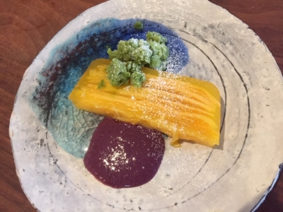 小島シェフが、今展の小高さんのバブーシュの色のコンビからイメージしたスペシャルドルチェです。