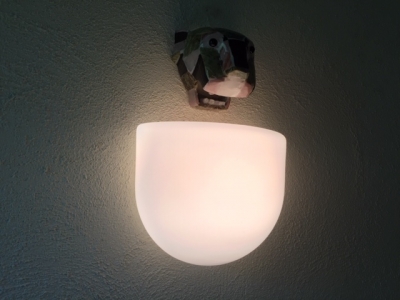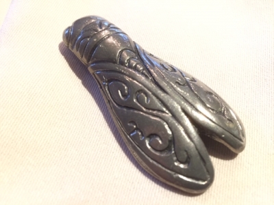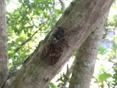 テーブルのナプキンウェイトや椅子のシートの柄がセミ。