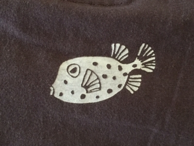 型を布に置き、染料を塗り付けてはがす、ステンシルのような技法です。