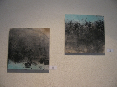 いろいろなカタチの石に、和紙を貼りこみ墨等で描いた作品です。