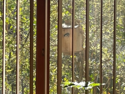 今朝もヤマガラ夫婦(ガーラと命名)が頻繁に巣箱周りに来ていました。