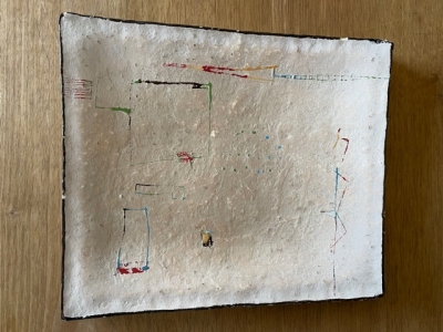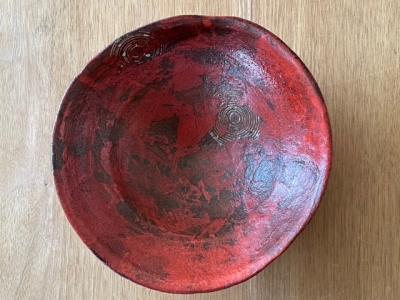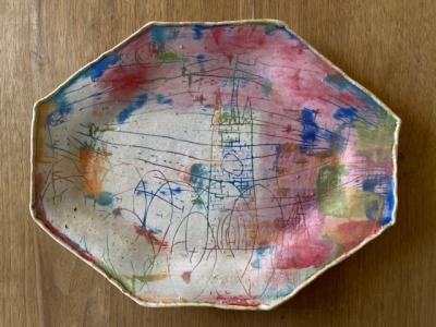 土のパッチワークのようなディテールに自然な歪みやおもしろいフォルムの器は、まるでオブジェのよう。