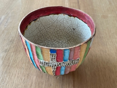 たたら(板状にした粘土)を切り取り、パッチワークのように貼り重ねていく。