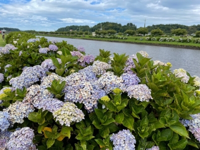 その前に、その近くの川沿いに咲き誇るアジサイを観ました。