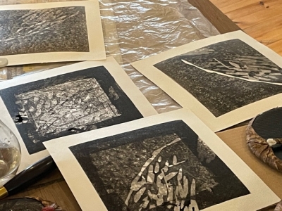 木版画の基本的な工程は、①下絵を描く ②版木に転写 ③彫刻刀で掘る ④馬連で摺る・・・。